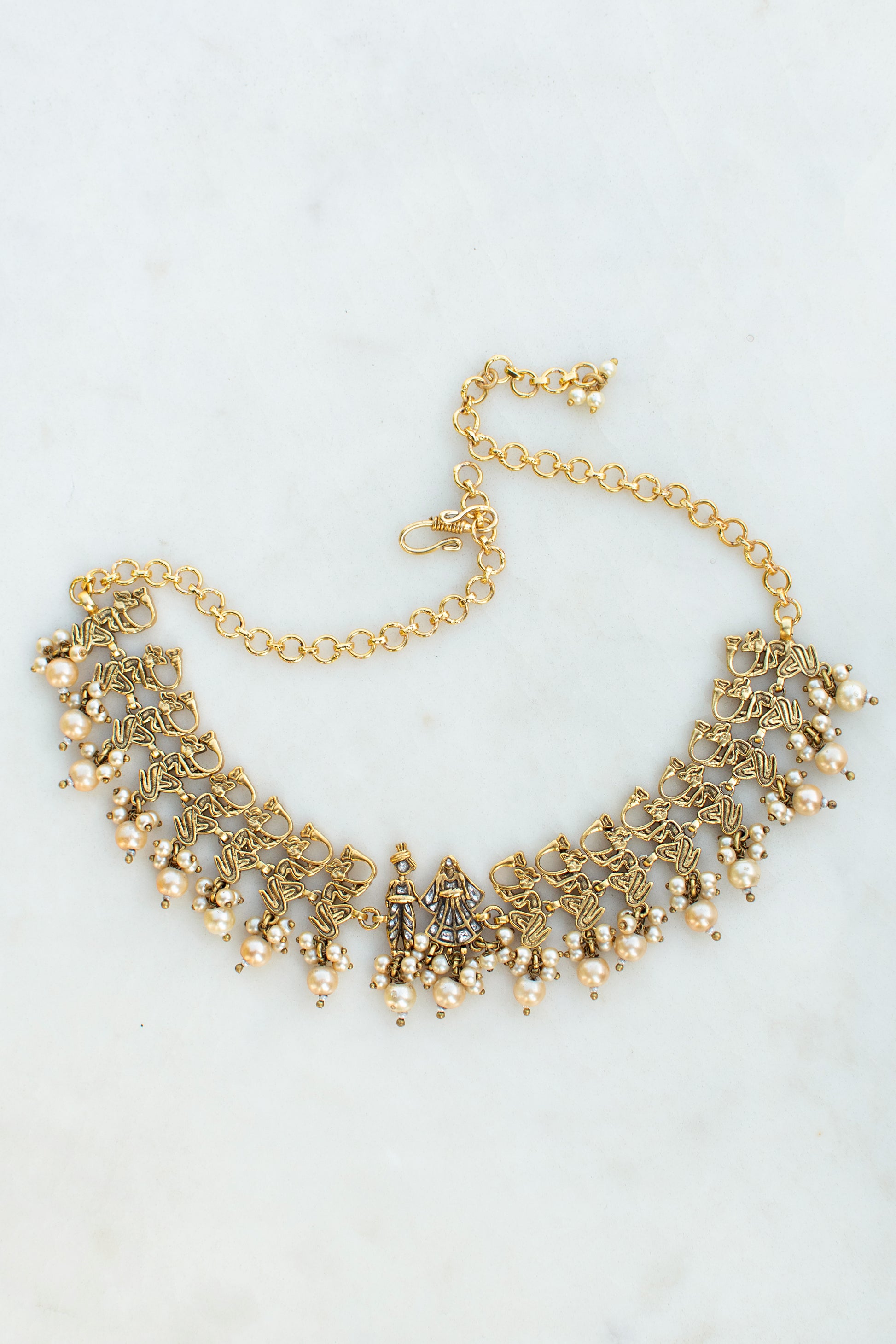 A tribute to timeless elegance, the GALA Necklace is a beautifully handcrafted statement piece made in high-quality brass. Adorned with shimmering stone polkis and delicate pearl hangings, it features intricate design details that exude artistic sophistication. Lightweight and designed to sit gracefully close to the neck, this necklace offers comfort and versatility with adjustable links on both sides and a secure hook closure. Perfect for festive occasions or adding a regal touch to any look.