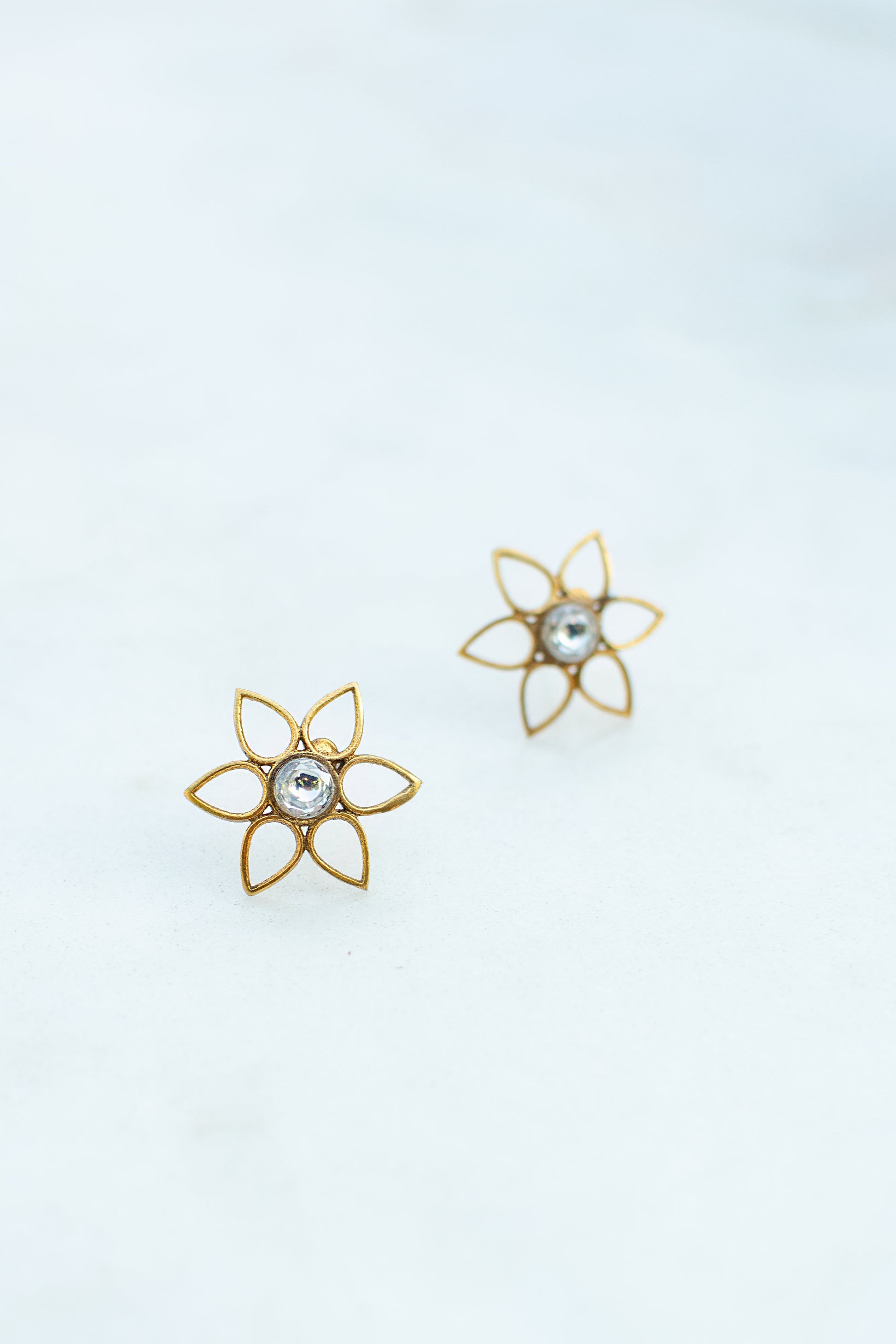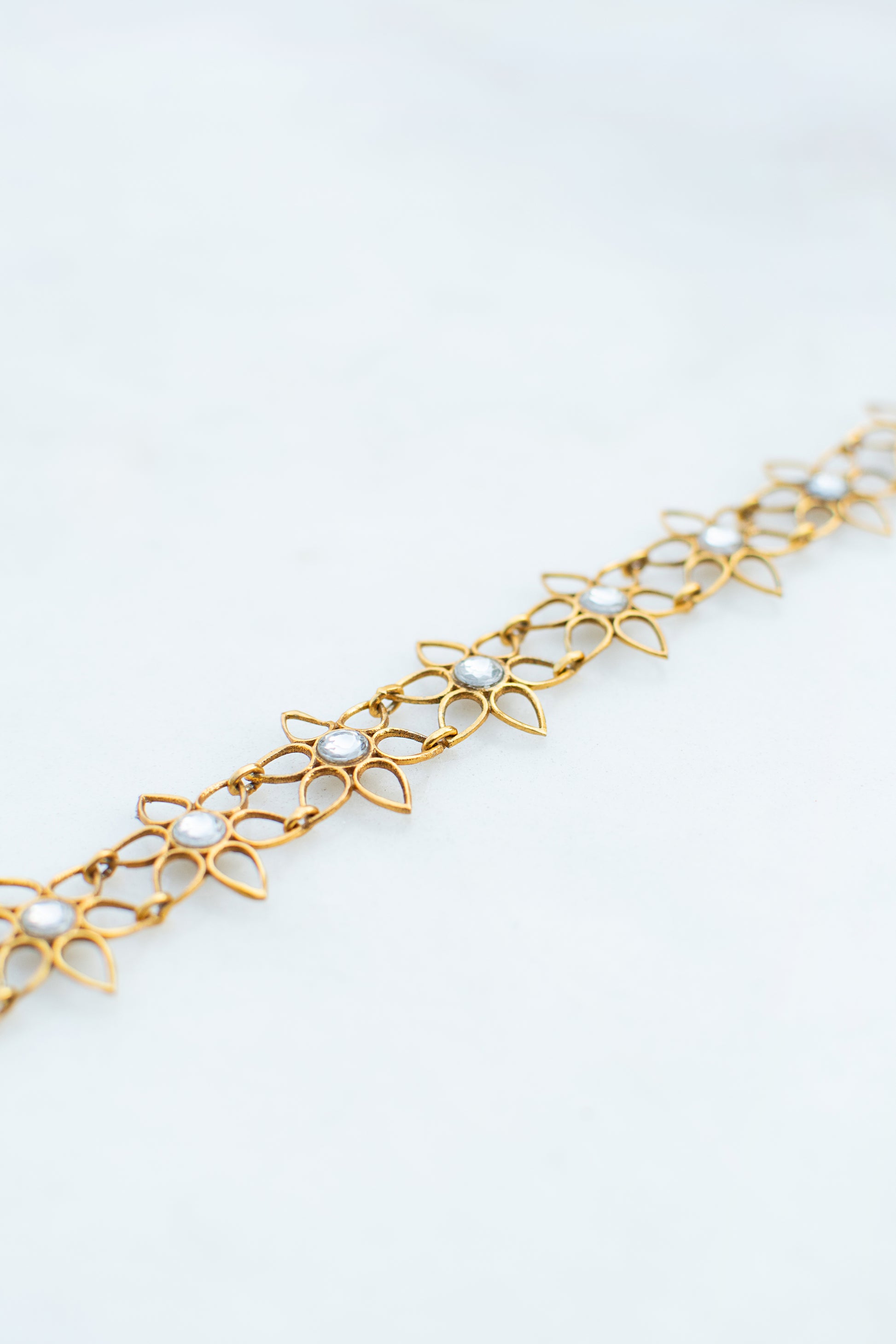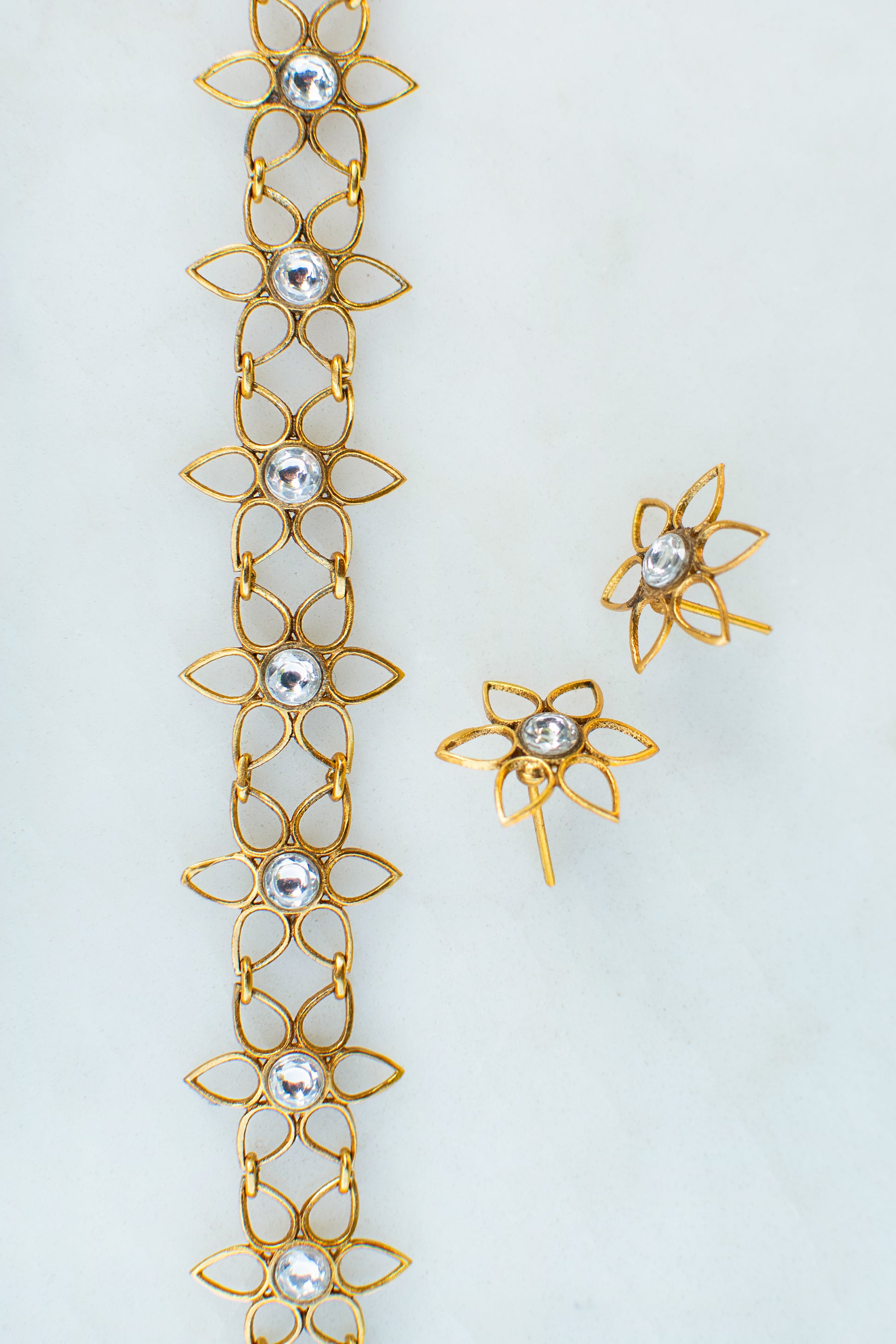 An ode to delicate artistry, the Floral Filigree Choker & Earring Set is a handcrafted ensemble made in brass and adorned with glistening Polki stones. The choker features airy floral filigree work, lending it a lightweight elegance that can also double up as a bracelet—making it as versatile as it is graceful. With adjustable links on both sides and a secure hook closure, it promises a comfortable fit. The accompanying petite studs complete the look with understated charm.